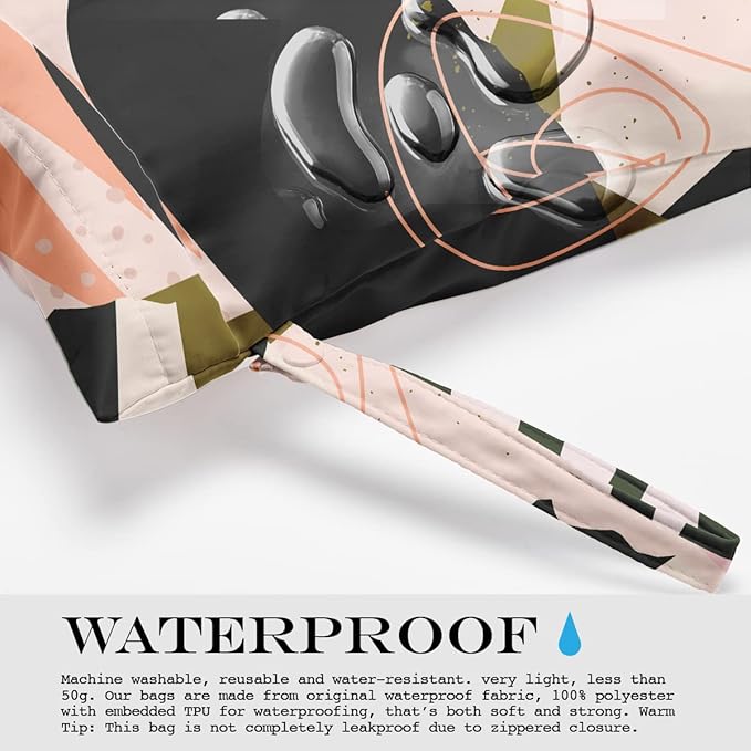 • WATERPROOF - Machine washable, reusable and water-resistant. very light, less than 50g. Our bags are made from original waterproof fabric, 100% polyester with embedded TPU for waterproofing, that’s both soft and strong. Warm Tip: This bag is not completely leakproof due to zippered closure.