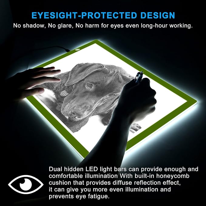 • NO SHADOW, NO GLARE, PROTECT EYES. The light pad provids ideal working lighting environment for penmanship and design. Providing the most comfortable lighting environment for animators, designers, art enthusiasts. children and reader.