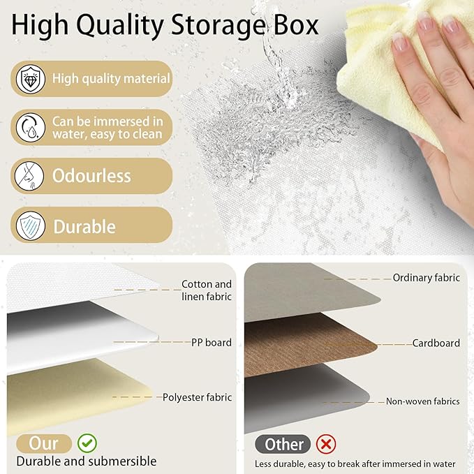 • Material: The storage containers are supported by pp board to ensure a rigid structure, no odour and allows storage box to be washed when it gets dirty, With inner surface of oxford cloth, much more sturdy and durable