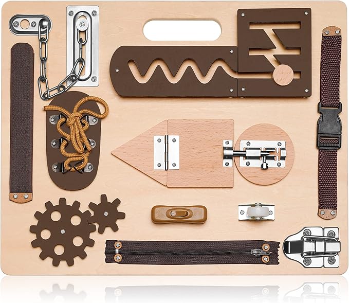 • Sensory Board Helps Toddler to Explore the World: The baby busy board develop fine motor skills, dressing skills, dexterity and brain development. The elements on the wooden learning toys helps the toddler trains finger grip, turning movements and learns how to control their hands. Every way of playing it is related to life, promotes play and learn excitement, allowing babies to learn the most common things in life. Perfect for ages 1 2 3 years old boys and girls.