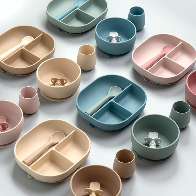 SAMiGO Silicone Baby Feeding Set, Baby Led Weaning Supplies, Suction Bowl Plate Bib Cup Self Feeding Spoons, Solid Food Eating Essentials, First Stage Utensils, 6+ Months