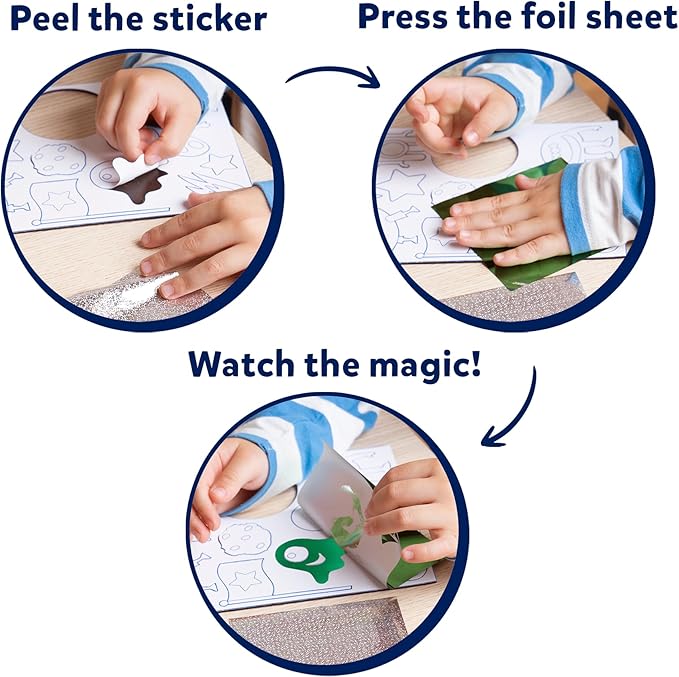 • FOIL ART & CRAFT ACTIVITY: Let your child's imagination soar with this magical, mess-free foil art and craft activity. They can create stunning pictures featuring planets, astronauts, shooting stars, and more, sparking hours of creative play!