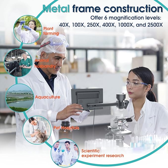 Microscope for Adults with 40X-2500X Magnification, Dual-View Research-Grade Compound Monocular Microscopes with 7'' LCD Screen, Wide-Field 10X 25X Eyepiece, Built in 5MP Camera, Dual Illumination