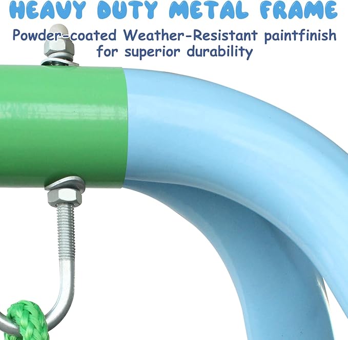 • 【Strong Construction】: The swing frame is made of sturdy iron tubes, all tubes are powder coated, waterproof and rust-proof, and can withstand any weather, so your baby can play on the grass, in the park, anywhere you like! The 4 ground pegs included with the swing set can keep the swing stable and reliable when inserted into the ground