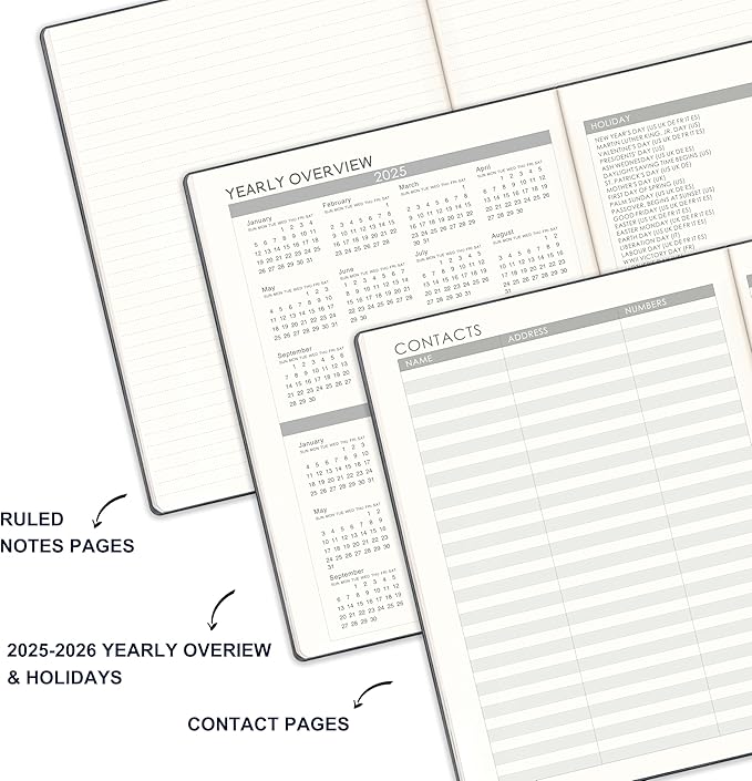 • ✨ Durable soft leather cover, excellent texture. 2025-2026 yearly holidays lets you master the holidays clearly. The planner offers unruled monthly pages/ruled weekly layouts for detailed planning.