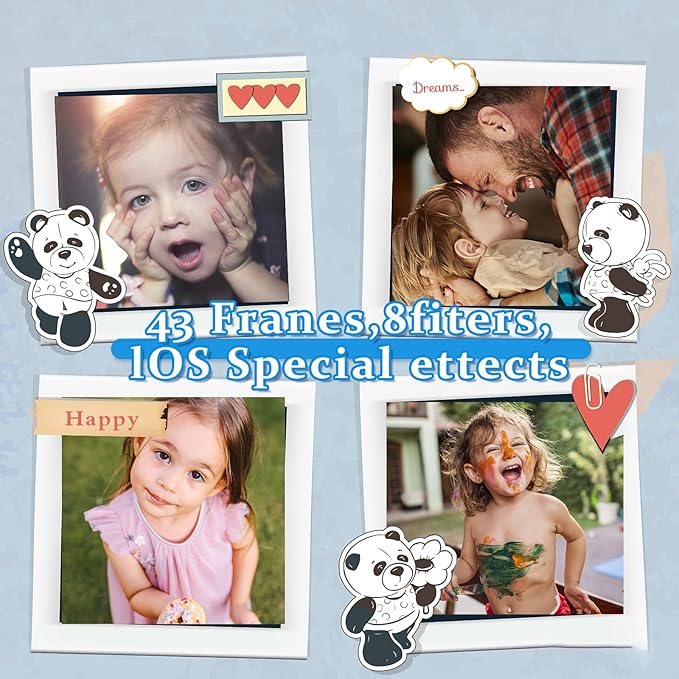 • 【Multi-functions】The kids camera comes with 43 Frames,8 filters,10 Special effects, has autofocus shooting, self-timer and time-lapse shooting, The automatic shutdown function can be selected in 2 seconds, 5 seconds,10 seconds,photos can be magnified 1-4 times, expandable storage capacity up to 32GB( the package within 32GB Micro SD card) - Bulit in 5 games,This not only a toy camera but a real camera to arouse child's creativity and hobby.