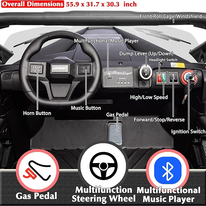 • Kids’ UTV with 1.4 Cu.Ft Dump Bed: The dump bed of this kids’ UTV is electric, kids can lift and down the dump bed by operating the joystick and handle, and it comes with a plastic shovel, your little kids can enjoy a transport experience with this side-by-side UTV. And the multifunctional music panel provides built-in music and devices connection functions (AUX/USB interface and wireless connection), enhances entertainments of this kids' toy car.