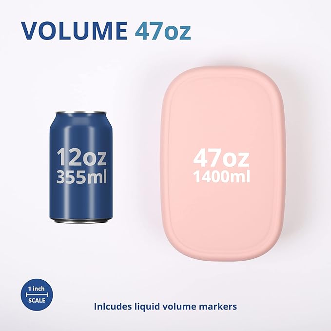 • Versatile and Durable - Our large silicone food container is ideal for storing lunch, leftovers, and snacks. It has liquid volume markers, and is temperature resistant (-40°F - 482°F), microwave friendly, unbreakable, easy to clean, and reusable.