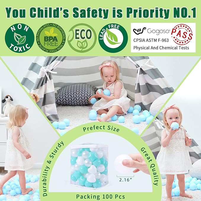 • PACKING - 100 pcs pack for home use. Great for filling any play tent, playpen, kiddie pool, baby playhouse, play yard, play pit, and bounce house. Great photo prop for dogs, cats, pets as well. Can use it at parties, backyard, parks, playgrounds, day care, school, carnivals.