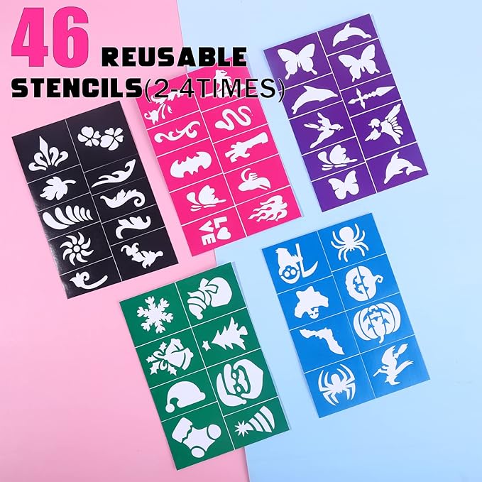 • 【Face & Body Paint Kit】Our face painting kit includes 16 bright colors and extra large black & white,2 glitters,3 brushes,5 face paint stencils,4 sponges,2 gem sheet,1 instructions.For everything you need to make a perfect look.