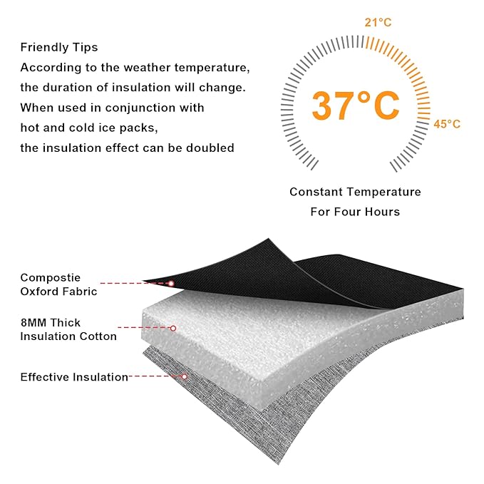 • HIGH QUALITY MATERIALS: Made of high quality water-resistant composite oxford fabric, 8mm extra-thick EPE foam and food-grade aluminum foil liner. No odor, non-toxic, food safe, durable, lightweight. Effectively keep bottles stay cold, warm or fresh for hours, it keeps breast milk fresh.