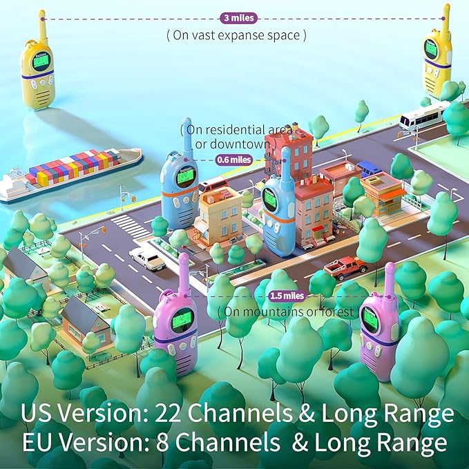 • With clear sound and long range capability, these two-way radios provide 22 channels and work up to 3 miles in open areas. Kids can enjoy stable and clear communication from half a mile to one mile in typical environments. Please note that hills or buildings may affect the range.