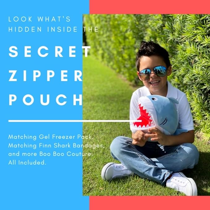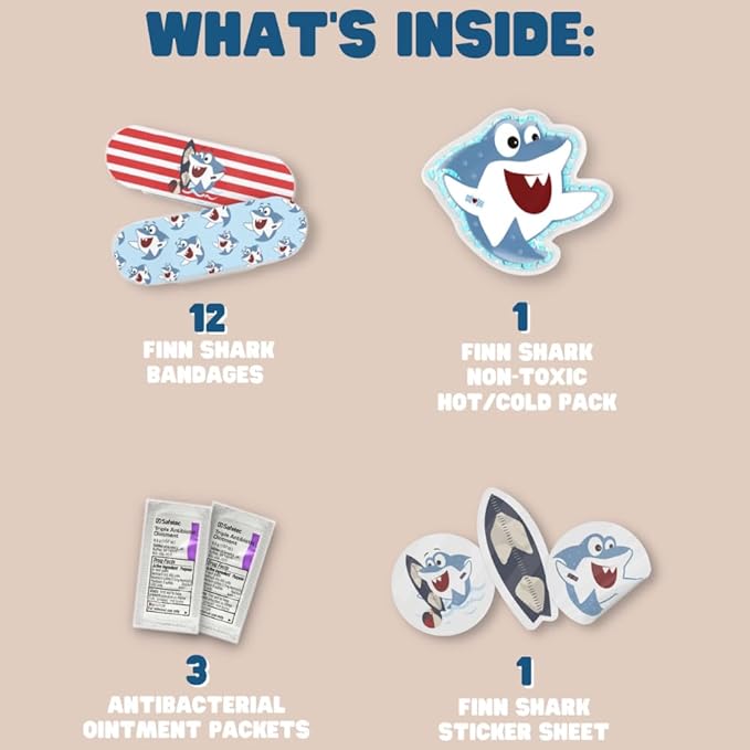 • 🦸‍♂️ The Set Includes: This kids first-aid kit plush includes 1-character ice pack (for hot & cold use), 12 matching Finn Shark bandages, 6 Finn Shark stickers, and 3 triple ointment packets. This infant first aid kit is packed in a secret zipper pouch on the stuffy’s back.