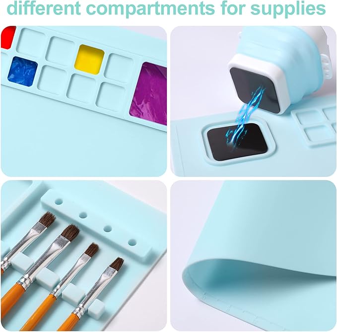 • [UNIQUE DESIGN] - Silicone painting mat has a collapsible attached cup with brush holders on the side and top, built-in paint wells, and brush rests. Keep clean while creating efficiently.