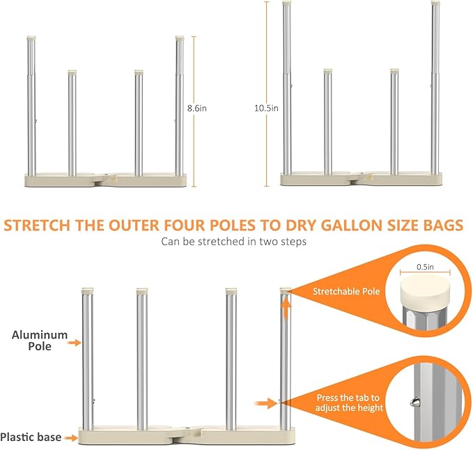 • 【Large Size】This reusable bag drying rack can be stretched to 10 inch high to dry gallon sized reusable bags and tall water bottles, it can hold 4 reusable bags and 8 bottles or cups maximum.
