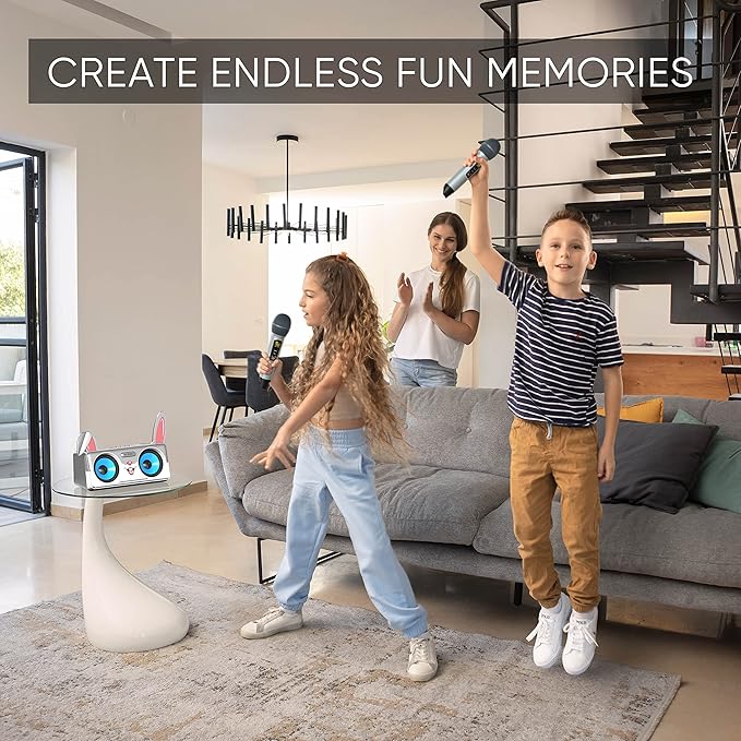 • 【No bunny but you】 - It’s a magic sing-along for every fiesta on the best karaoke machine for kids! The powered 15-watt Bluetooth speaker with microphone set doubles as a portable PA system with wireless mic (actually, two mics). A perfect birthday gift for boys and girls!