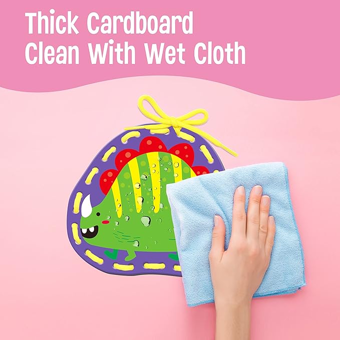 • Cute Animal Patterns: The pattern covers diverse adorable dinosaurs, like stegosaurus, triceratops, Diplodocus and other lovely dinosaurs. The patterns on cards are colorful, big and vibrant. The holes are clearly cut and easy for preschoolers to work with. The strings are easy for children to use and fit into the holes easily.
