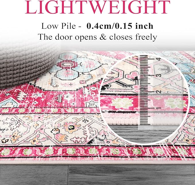 • Functional Lightweight Rug - Lahome ultra-thin rugs are made with everyday use in mind and high-traffic areas. 0.15 inches thickness allows for convenient placement in hallway, kitchen, entryway and underneath furniture. The door opens and closes freely