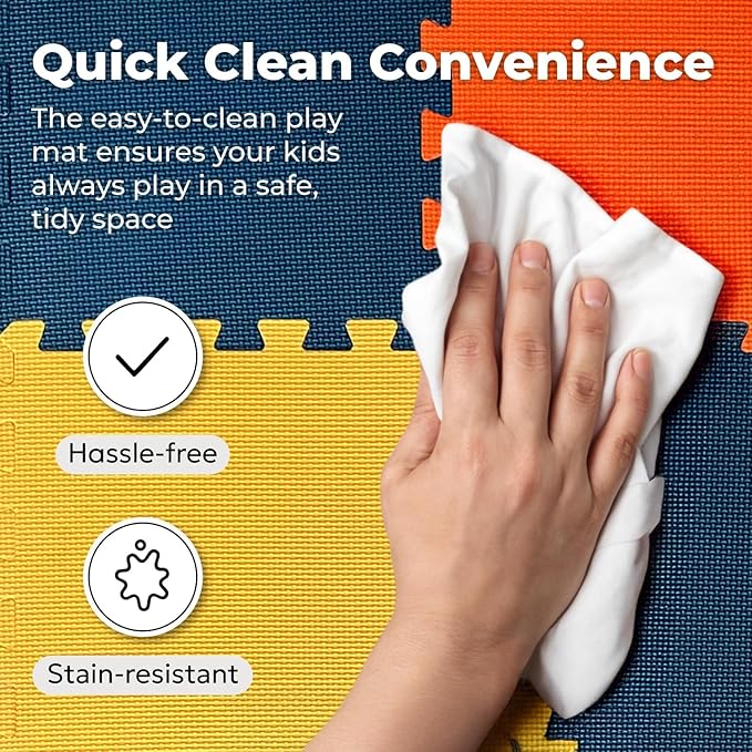 • ๐Ÿ˜ด EASY-TO-ASSEMBLE INTERLOCKING FOAM TILES: Our 12.4 x 12.4-inch interlocking foam tiles fit securely together, creating a customised play area for any room. Choose from our 16-piece set (covers 16 sq ft) or 36-piece set (covers 36 sq ft), each with matching borders for a polished look.