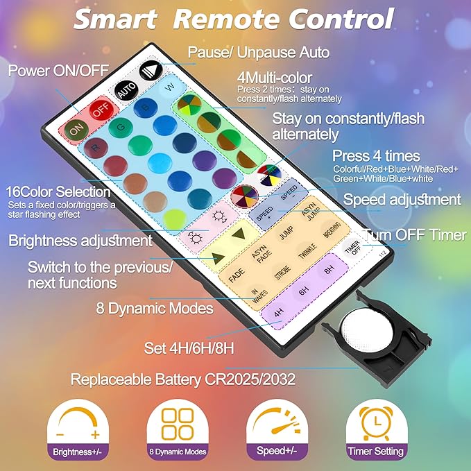 • Remote Control String Lights:Twinkle lights provides remote to power color changing string lights on/off, change 16 single colors and 8 mixed colors, choose 128 dynamic modes, adjust 4 speed, set 3 timer.The string lights indoor will remember the last option it previously set