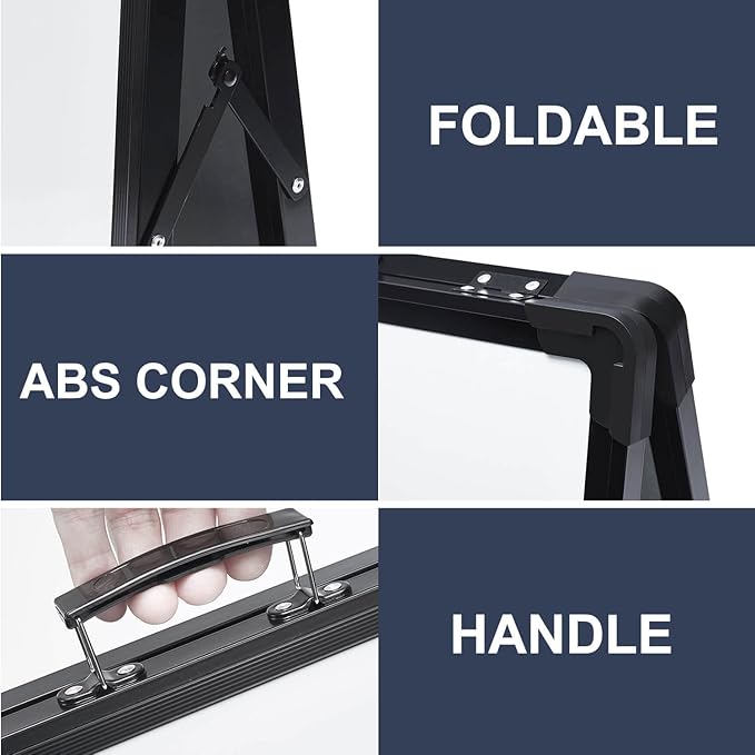 • STURDY AND PORTABLE - Double sided stand up small tabletop magnet dry erase whiteboard easel with solidly built but light weight. It is portable with a handle on the top for travelling.