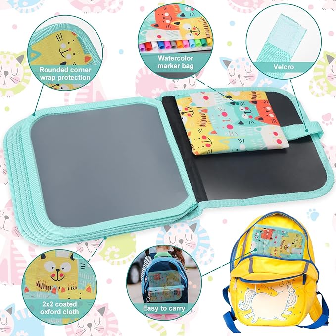 • 🎨Kid's Road Trip Essentials--Kids Erasable Graffiti Book has sticky buttons on the outside to keep it in place and a pens pocket on the inside for 12 watercolor pens. Even in cars, planes and other means of transportation, kids can draw as much as they want.