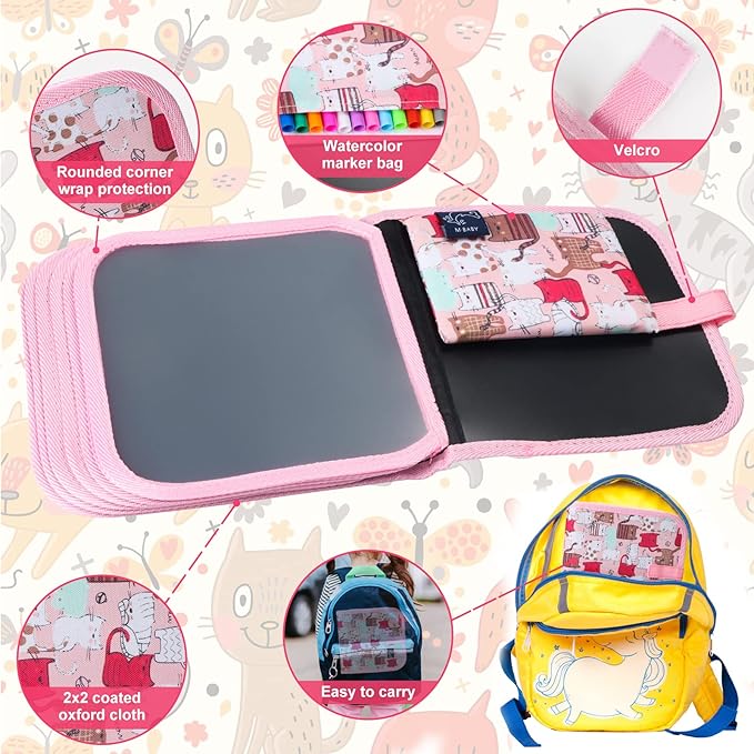 • 🎨Kid's Road Trip Essentials--Kids Erasable Graffiti Book has sticky buttons on the outside to keep it in place and a pens pocket on the inside for 12 watercolor pens. Even in cars, planes and other means of transportation, kids can draw as much as they want.