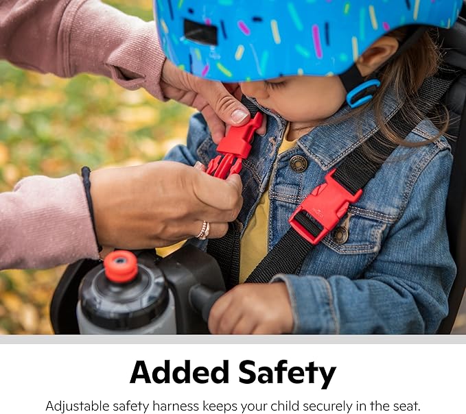 • SAFETY FIRST: Adjustable harness with side-clasp buckles and height-adjustable foot wells with safety straps keep your child securely fastened in the kid bike seat while riding.
