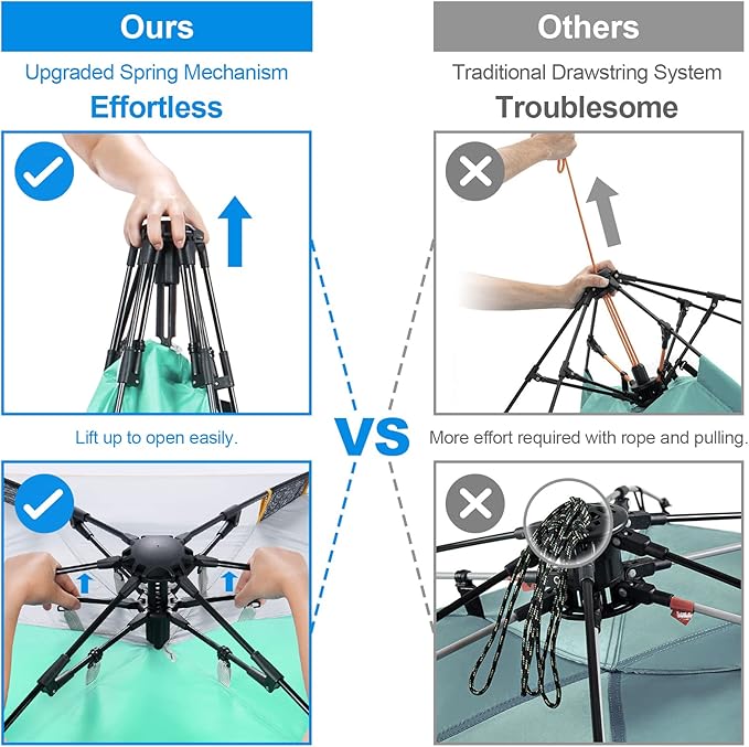 • Easy Setup & Super Stable: The specially designed spring opening system shows an industry-leading level of improvement. One person can set up the beach tent easily in seconds. Compared to the drawstring design, this one is faster, effortless, and saves more time. The 8.5 mm thick fiberglass poles make the tent stronger. Equipped with 3 sandbags, 4 wind ropes and 10 stakes to ensure stability and prevent it from being blown away in the wind.