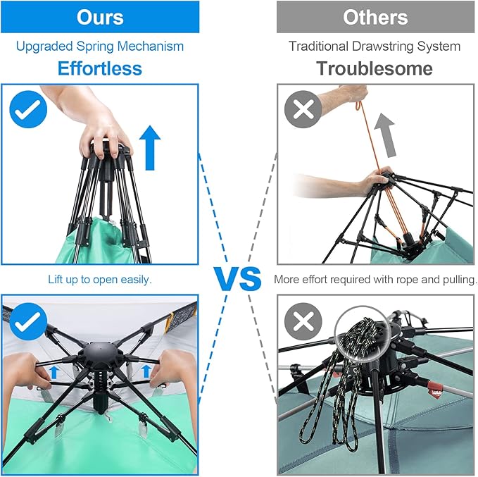 • Easy Setup & Super Stable: The specially designed spring opening system shows an industry-leading level of improvement. One person can set up the beach canopy easily in seconds. Compared to the drawstring design, this one is faster, effortless, and saves more time.