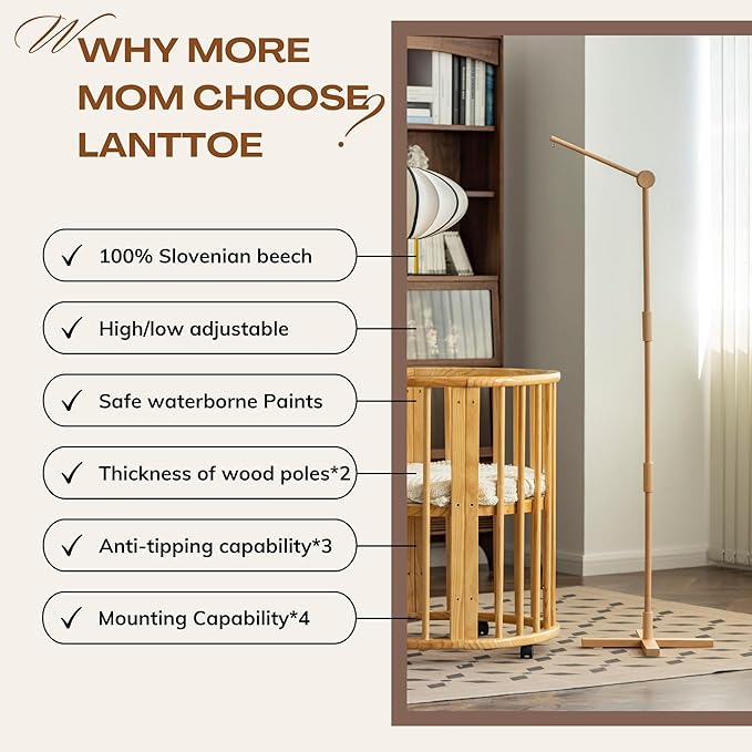 • 【Fits 99% of Cribs】Designed by a professional structural mechanics design team, our floor-standing mobile arm's anti-toppling ability is twice that of other mobile arm. All the wooden pole connections are made of built-in high-strength metal components. The width of the core wooden pole reaches 0.78 inches, and the bottom is designed to cross the floor for greater contact area and stronger loading capacity,all this, just for safety(Note: Maximum load is 2 lb).