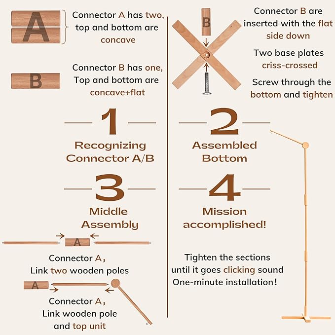 • 【Distinguish Connector A/B】In just one minute, you can easily assemble our products. All the rotating connections of the wooden poles, we recommend that you turn until the "gobble" sounds, so as to ensure the better use of our products,when not in use you can take them apart for compact storage.