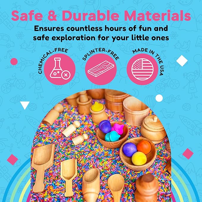 • Handcrafted in the USA: Crafted from premium birch or maple hardwood, these wooden sensory bin tools are built to withstand countless hours of play. You can trust in the exceptional quality of this kids wooden tool set, which is crafted in the USA.