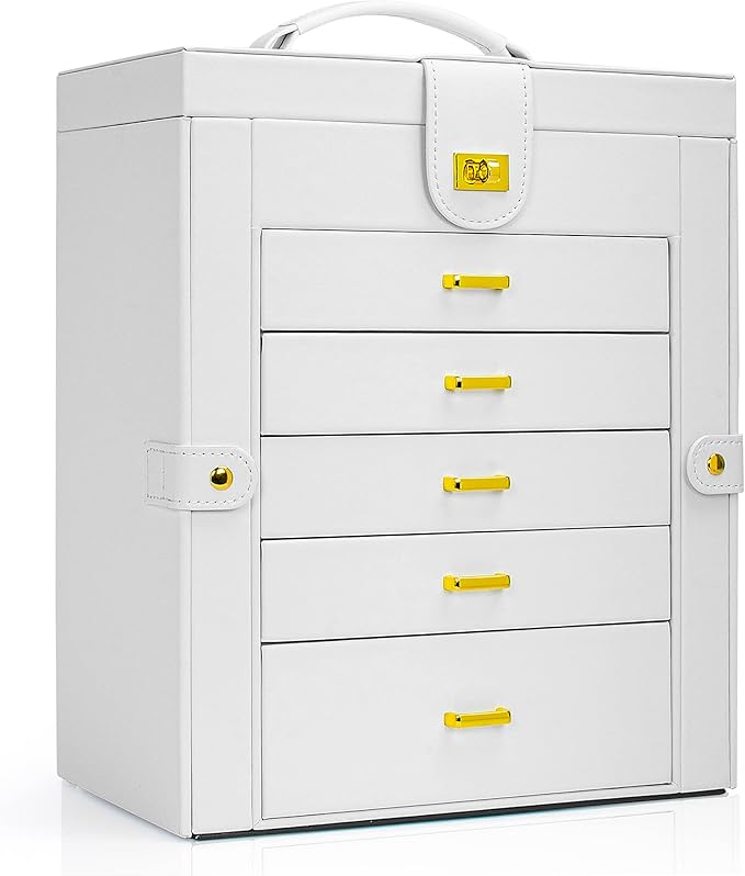 • LARGE CAPACITY: With 6 versatile pull out drawers, this white jewelry box can store a lot of jewelry accessories, such as rings, earrings, necklaces, chains, bracelets, and so on. Soft pillows in the bottom drawer suit for storing watches. One deeper drawer is designed for sunglasses or large jewelries