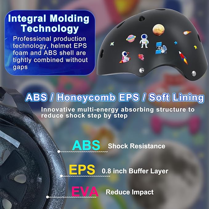 • 【Unique DIY Kids Helmet】 Toddler helmet included space themed stickers, your kids can enjoy and use their imagination to create their own customized bicycle helmet. With knee pads and elbow pads set, effectively protects your kids from injuries during multi-sports, not only protects the baby but also delights the mood. The designed bicycle helmet is a great gift for kids 3-8 years old. (One sticker picture will be given randomly)