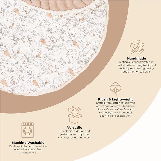 • MAGICAL PLAYMAT: Step into a magical forest with this woodland play mat, designed to stimulate your child's imagination and curiosity. This woodland tummy time mat is adorned with friendly foxes, wise owls, and cuddly bears, captivating your child's attention and fostering a love for nature.