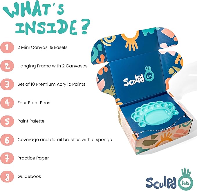 Sculpd Kids Painting Kit, Paint Craft Set for Kids Age 4 to 6, Includes 10 Colour Paint Set, 4 Paint Pens, 2 Canvases, Easels, Magnetic Picture Frame, Additional Art Supplies and Free Guidebook