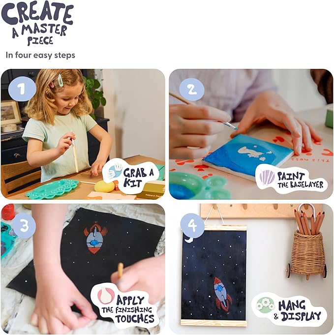 • KIDS PAINTING KIT 🎨 - In this crafty kit, kids will find everything they need to paint eight amazing works of art! They'll have their very own collection of paintings to display proudly in their room (or should we say gallery!). Create abstract and pop-art pieces on a hanging canvas and two mini-canvases.