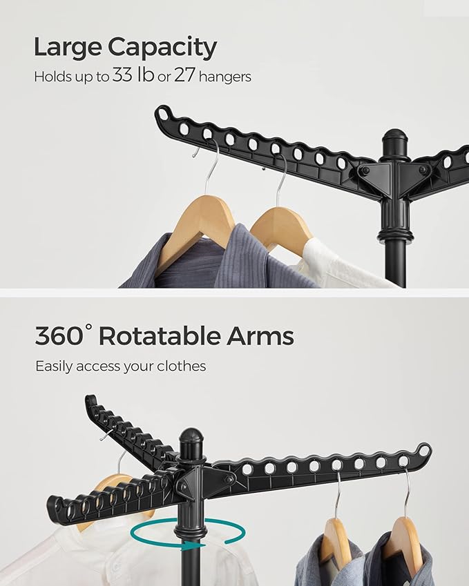 • [Large Capacity] Designed with holes on the arms for holding hangers in place, this laundry rack can hold up to 27 pieces of clothes and other accessories; total max. static load capacity: 33 lb