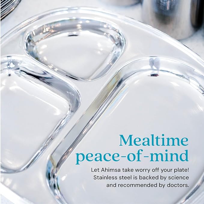 • 𝐏𝐞𝐝𝐢𝐚𝐭𝐫𝐢𝐚𝐧 𝐃𝐞𝐬𝐢𝐠𝐧𝐞𝐝 𝐰𝐢𝐭𝐡 𝐅𝐨𝐨𝐝-𝐒𝐚𝐟𝐞 𝟑𝟎𝟒 𝟏𝟖/𝟖 𝐒𝐭𝐚𝐢𝐧𝐥𝐞𝐬𝐬 𝐒𝐭𝐞𝐞𝐥: Ahimsa Balanced Bites stainless steel kids plates are thoughtfully designed for kids’ health and safety. Our toddler plates with dividers are crafted from high-quality food-safe 304 18/8 stainless steel to prevent chemical transfer and eliminate soapy aftertastes. Our toddler stainless steel plate makes safe eating simple and joyful