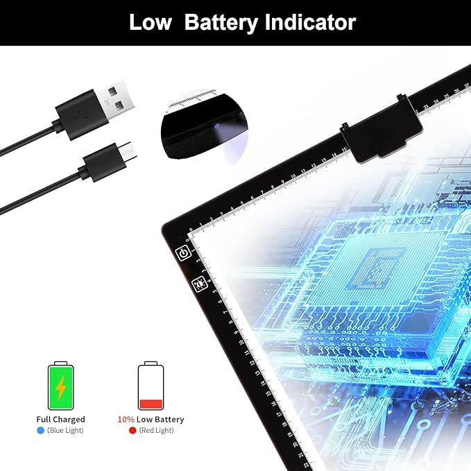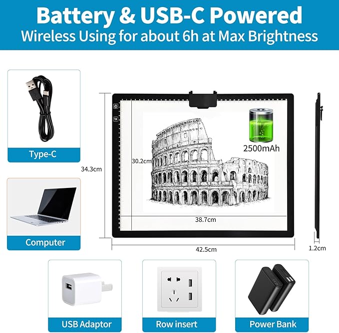 • 【 Built-in Battery and USB-C Powered 】 Our LED lightbox comes with a 2500mAh internal battery which allows you to use it any where without any power source, which makes your project more convenient as well as more enjoyable! Works for around 5-6 hours after charged 2 hours at a time. This A3 lightpad uses a USB-C interface to easily access any USB port, such as a USB wall charger, computer, laptop or mobile power bank. Also,the USB-C interface is more stable than the Micro interface.