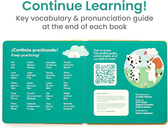 • ๐—ฆ๐˜‚๐—ฝ๐—ฝ๐—ผ๐—ฟ๐˜๐˜€ ๐—ฆ๐—ฝ๐—ฎ๐—ป๐—ถ๐˜€๐—ต ๐—Ÿ๐—ฎ๐—ป๐—ด๐˜‚๐—ฎ๐—ด๐—ฒ ๐—Ÿ๐—ฒ๐—ฎ๐—ฟ๐—ป๐—ถ๐—ป๐—ด. This childrenโ€™s book is bilingual and features text in English and Spanishโ€“ it is ideal for supporting Spanish language learning. There is also a vocabulary and phonetic pronunciation guide included on the last page, as well as free online educational resources for parents to aid bilingual learning. These bilingual spanish baby books, spanish baby toys, are designed to support babies and toddlers 1-3 in learning Spanish.