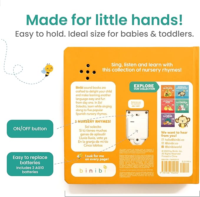 • ๐——๐˜‚๐—ฟ๐—ฎ๐—ฏ๐—น๐—ฒ & ๐— ๐—ฎ๐—ฑ๐—ฒ ๐—™๐—ผ๐—ฟ ๐—Ÿ๐—ถ๐˜๐˜๐—น๐—ฒ ๐—›๐—ฎ๐—ป๐—ฑ๐˜€. Binibi bilingual English-Spanish books for babies & toddlers 1-3 are durable and feature hard covers, thick pages and rounded corners - they are made for little hands and are easy to clean! All musical Spanish nursery rhyme books feature an on/off button for extended battery life, and easily replaceable batteries. 3 AG10 batteries in every book.