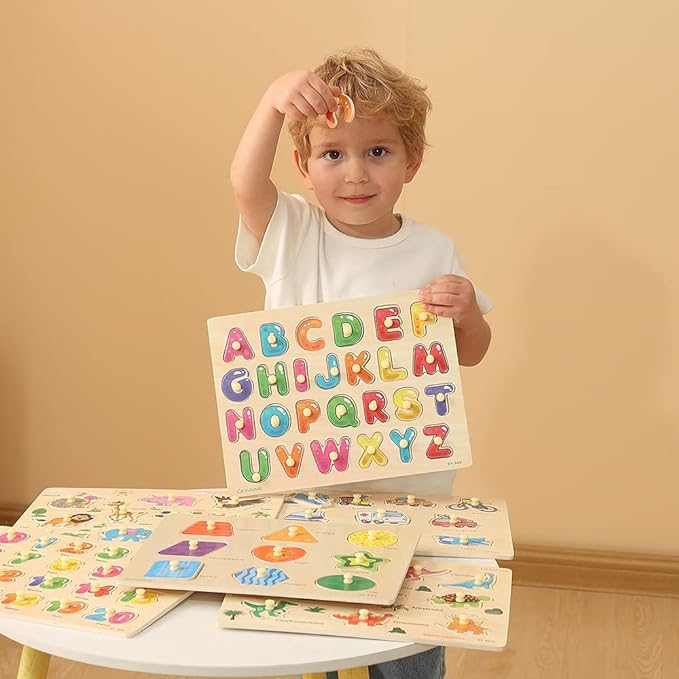 • [6 PCS PUZZLE GIFT PACK]: Package comes with a box and 6 wooden peg puzzle-alphabet puzzle , a number puzzle, a shape puzzle, an animal puzzle, a dinosaur puzzle and a vehicle puzzle.