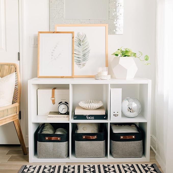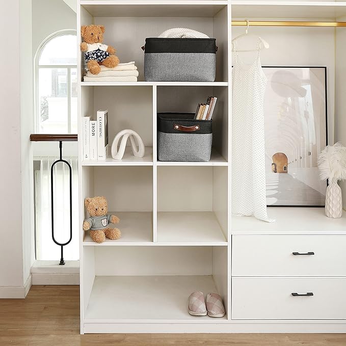• Decorative Fabric and Vegan Leather – These versatile storage baskets for organizing your everyday life are made with a thick, high-quality fabric and fitted with leather handles to add a stylish touch to a living room, bedroom, office, or personal space.