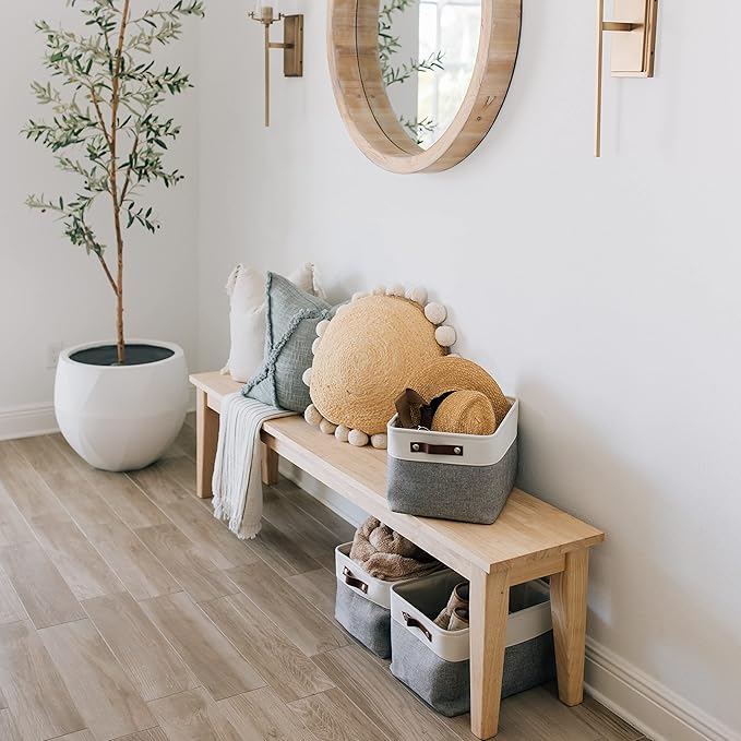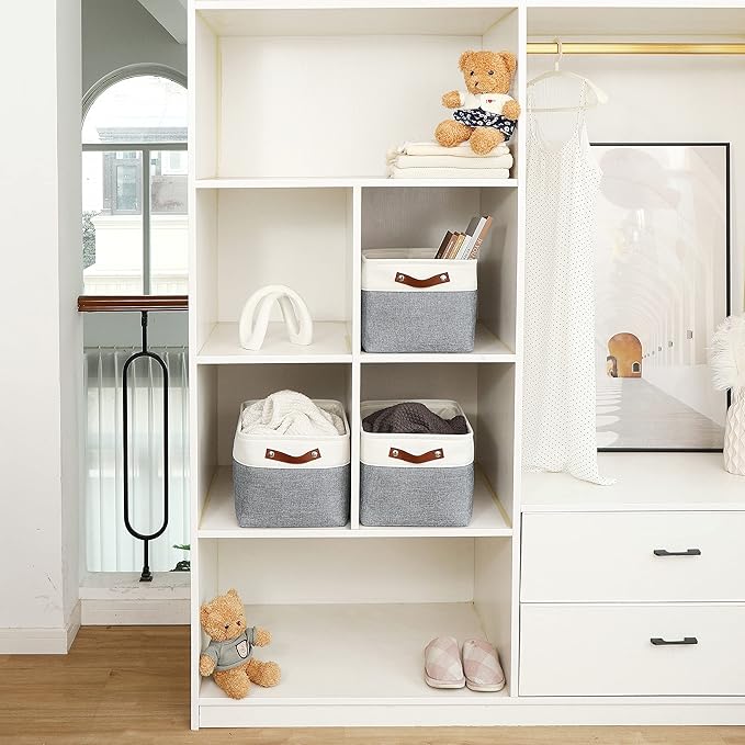 • Decorative Fabric and Vegan Leather – These versatile storage baskets for organizing your everyday life are made with a thick, high-quality fabric and fitted with leather handles to add a stylish touch to a living room, bedroom, office, or personal space.
