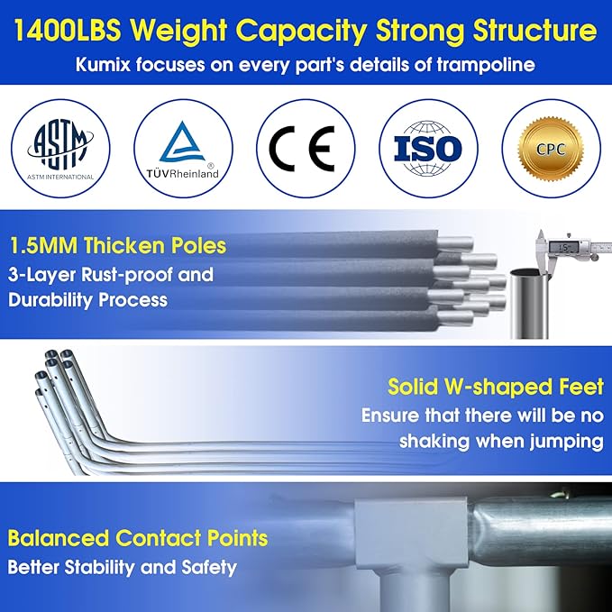 • ๐Ÿ‘1400Lbs Max Weight Capacity: SKYUP 14FT trampoline passed ASTM F381-16 Standard Safety Specification for Components, and CPC, Chemical Test. Due to the 8PCS heavy-duty galvanized steel frame, 4 U-legs, and 80pcs galvanized springs, the trampoline is sturdy and can hold a capacity of up to 6-8 kids. Advise SINGLE person to weigh no more than 330LBS.