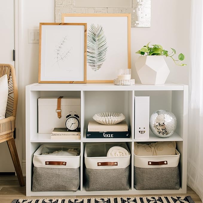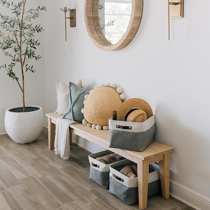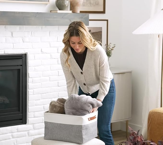 • Decorative Fabric and Vegan Leather – These versatile storage baskets for organizing your everyday life are made with a thick, high-quality fabric and fitted with leather handles to add a stylish touch to a living room, bedroom, office, or personal space.