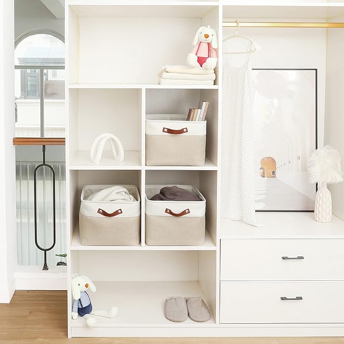 • Decorative Fabric and Vegan Leather – These versatile storage baskets for organizing your everyday life are made with a thick, high-quality fabric and fitted with leather handles to add a stylish touch to a living room, bedroom, office, or personal space.