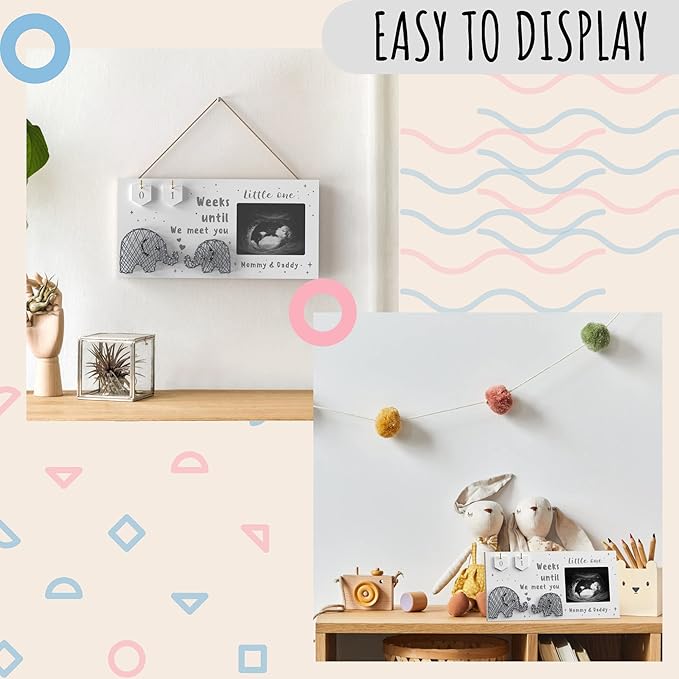 • Baby Countdown Frame - Celebrate the joy of expecting a new arrival with our ultrasound picture frame. Featuring a charming countdown display made up of two wooden number plaques, the frame allows you to track the weeks until your little one's arrival. Whether it's displayed on a mantle, bookshelf, or bedside table, our Baby Countdown Frame is sure to bring warmth and excitement to any room.